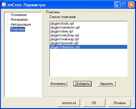 Чтобы просмотреть список подключенных плагинов откройте вкладку "Плагины" диалогового окна "Параметры" (Options) (двойной щелчок на иконке nnCron в системном трее). Кнопки "Изменить", "Добавить" и "Удалить" (Edit/Add/Delete) служат для добавления новых и удаления неиспользуемых плагинов.