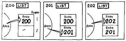 Допустим, в вашей системе имеются два буфера и вы выполняете следующие действия. Сначала вы распечатываете блок 200. Система считывает его с диска и пересылает в буфер 0, откуда слово LIST выводит этот блок на печать. Далее вы распечатываете блок 201. Система копирует блок 201 с диска в другой буфер. И наконец, вы распечатываете блок 202. Система копирует данный блок с диска в буфер, который применялся в первую очередь, а именно в буфер 0.