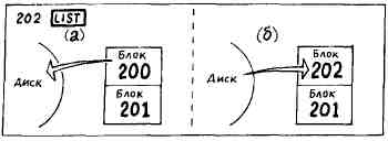 Что случилось с бывшим содержимым буфера 0? Оно просто было замещено (затерто) новым содержимым. Старая информация для нас не потеряна, так как блок 200 все еще остается на диске. Но если бы вы отредактировали блок 200, были бы утеряны ваши исправления? Нет, конечно. При распечатке блока 202 сначала измененное содержимое блока 200 посылается на диск с тем, чтобы обновить прежнее содержимое этого блока, а затем в буфер помещается содержимое блока 202.