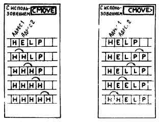 Команды для пересылки строк литер или массивов данных весьма просты. Каждой команде требуются три аргумента: исходный адрес, конечный адрес и значение счетчика.