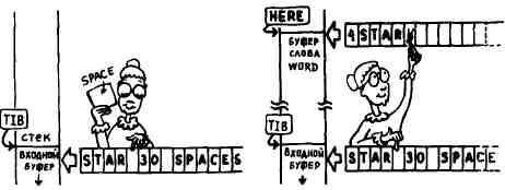 Мы полагаем, что в таких системах буфер слова WORD начинается с Н ERE, поэтому здесь не требуется пересылка строки и счетчика в словарь. Адрес, оставляемый в стеке словом WORD, является адресом со счетчиком, там что слово С@ помещает значение этого счетчика в вершину стека Затем слово ALLOT продвигает указатель словаря по длине строки (плюс один из-за счетчика), резервируя память для нее в словаре