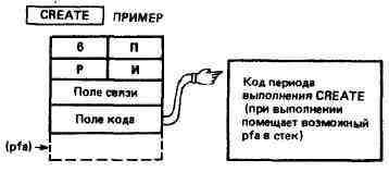Слово CREATE считается родителем, а слово ПРИМЕР - ребенком. Что делает ребенок в период выполнения? Он помещает свой собственный pfa в стек. А откуда он знает, что нужно делать именно это? Мы не задавали непосредственно ему никакой программы для выполнения. Ответ прост - ПРИМЕР вообще не содержит кода периода выполнения. Его указатель кода указывает на родителя (CREATE), у которого код периода выполнения есть.