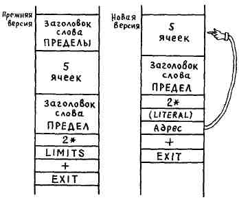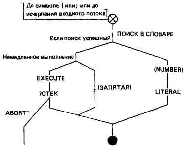 Сравните обе диаграммы, и вы увидите, что интерпретатор может вызывать ] для того, чтобы определить, будет данное слово выполняться или компилироваться. Такая простота в организации системы позволит вам легко добавлять новые компилирующие слова.