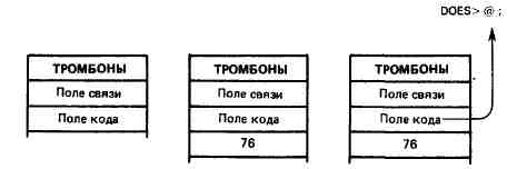 Выполнение слова ТРОМБОНЫ. Поскольку указатель поля кода слова ТРОМБОНЫ теперь указывает код, следующий за DOES>, выбирается значение (76) и помещается в вершину стека. Обратите внимание на то, что в фазе 3 слово DOES> сначала помещает в вершину стека pfa ребенка. Иными словами, определение