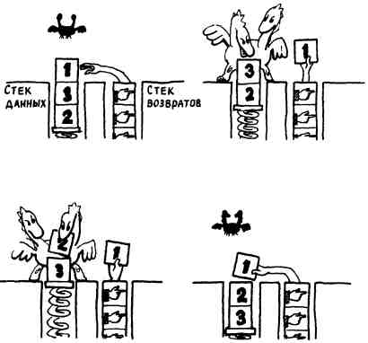 Подобно стеку данных, стек возвратов организован по принципу «последним внесен - первым выбран», поэтому в нем может храниться много значений. Но здесь имеется одна тонкость: данные, внесенные в стек возвратов, вы должны выбрать из него прежде, чем дойдете до конца соответствующего определения (точки